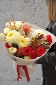 Букет в осінніх тонах з додаванням гілочок ілекса, леукосперумом, хризантемою та трояндою